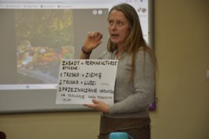 To intensywne, trzygodzinne spotkanie, zorganizowane w ramach 3. edycji Akademii Klimatycznej projektu „Biblioteki dla klimatu”, poprowadziła Pani Danuta Nowak z Ptasia Dolina – Dom Spotkań Twórczych. Warsztaty harmonijnie połączyły teorię z praktyką: najpierw w gościnnym ogrodzie ćwiczyliśmy kluczowe metody permakultury, takie jak zakładanie grządki, kompostowanie i ściółkowanie. Następnie, w bibliotece, omówiono fundamentalną rolę bioróżnorodności gleby oraz naturalne sposoby wspierania jej żyzności, co jest niezbędne dla stworzenia ogrodu odpornego na suszę. Uczestnicy zdobyli też praktyczną wiedzę na temat pozyskiwania i tworzenia własnych banków nasion. Gorące podziękowania kierujemy do Państwa Marii i Czesława Kaniów za udostępnienie ogrodu na część praktyczną oraz do wszystkich uczestników za aktywne zaangażowanie i wniesioną energię. Mamy nadzieję, że zdobyta wiedza posłuży budowaniu lokalnych, przyjaznych klimatowi ogrodów.